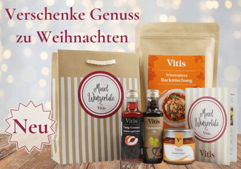 Als besonderes Extra findest du in der Mosel Winzertüte einen Flyer mit einem köstlichen Rezept, dass die Zutaten miteinander vereint. Außerdem erfährst du mehr über den Schatz der Weinberge – unser Vitis Traubenkernöl.